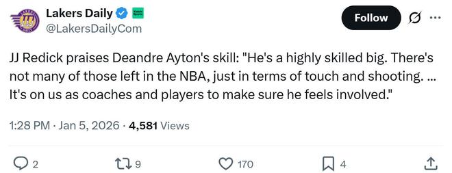 赛后雷迪克称赞道:“艾顿是一名技术极为全面的内线球员,单论手感和投射能力,他是如今NBA里的凤毛麟角,我们有充分的理由让他融入体系。”