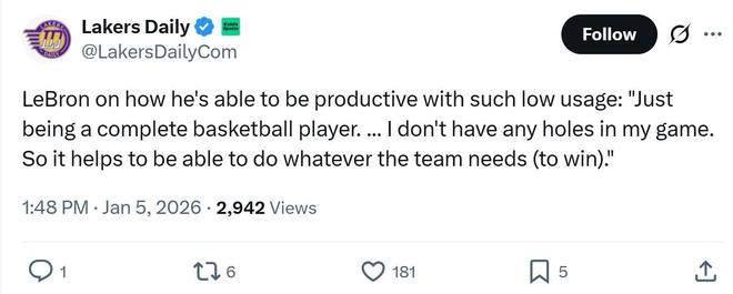 赛后被问到如何在球权降低的情况下保持高效,詹姆斯坦言:“成为一名全能的球员,我的比赛没有任何短板,所以球队需要什么,我就能做到什么。”