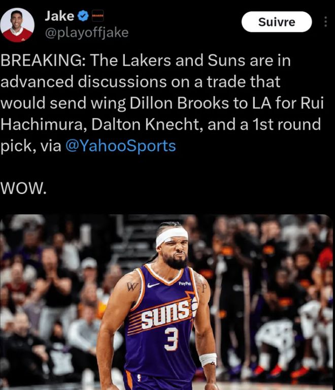 据美媒YahooSports也报道称,洛杉矶湖人有意与菲尼克斯太阳商讨一笔重量级交易,计划用八村塁、克内克特加上一个首轮签的筹码,打包交易得到太阳锋线悍将狄龙·布鲁克斯。这则消息一经传出,迅速引发整个NBA圈子的热议,尤其是对于湖人球迷而言,狄龙与詹姆斯这对“欢喜冤家”若真能披上同款紫金战袍,这样的画面想想都足够震撼。