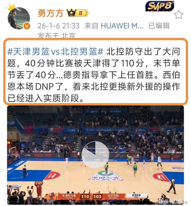 媒体人勇方方,在赛后对北控的防守提出质疑,他在社媒发文点评本场比赛讲道。“北控防守出了大问题,40分钟比赛被天津得了110分...德贵指导拿下上任首胜。西伯恩本场DNP了,看来北控更换新外援的操作已经进入实质阶段。 ”。