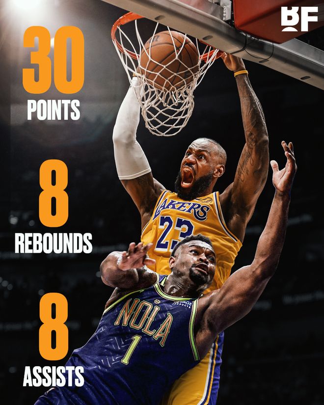 - 勒布朗30+8+8湖人逆转鹈鹕3连胜,东契奇30+10墨菲42+5