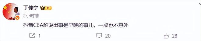 裁判专家丁佳宁更是怒斥:抖音CBA解说出事是早晚的事儿,一点也不意外。他还说,我前几年说CBA现场像菜市场,没想到如今CBA把直播也搬到了菜市场。大家都知道,菜市场是什么样子,那就是乱哄哄的样子。抖音获得CBA直播权后,让一些不三不四的主播带货直播,他们中有一些人根本没有专业知识,对体育知识了解不多,解说和表达能力极差,甚至说出一些不当的话。因此,球迷呼吁抖音CBA平台应该进行整顿,严格把关和审核,有直播资格的人才能担任解说,不能再让阿猫阿狗来担任解说员了。
