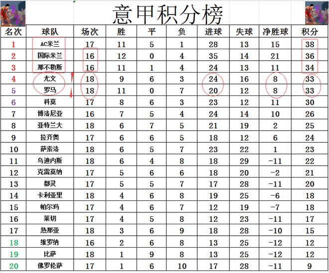 积分榜方面,AC米兰先赛赢球后,超过国米2分登顶,那不勒斯差AC米兰4分排在第3。尤文和罗马今天都有机会超过那不勒斯暂时进前3的,但是两队都无力赢球,尤文拿到1分,倒是凭借着进球优势将罗马挤出前4。