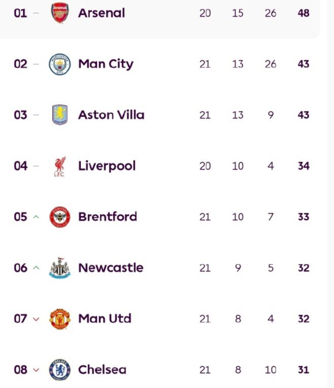 - 英超最新积分战报 阿森纳开心!切尔西输球 曼城维拉曼联平局丢分